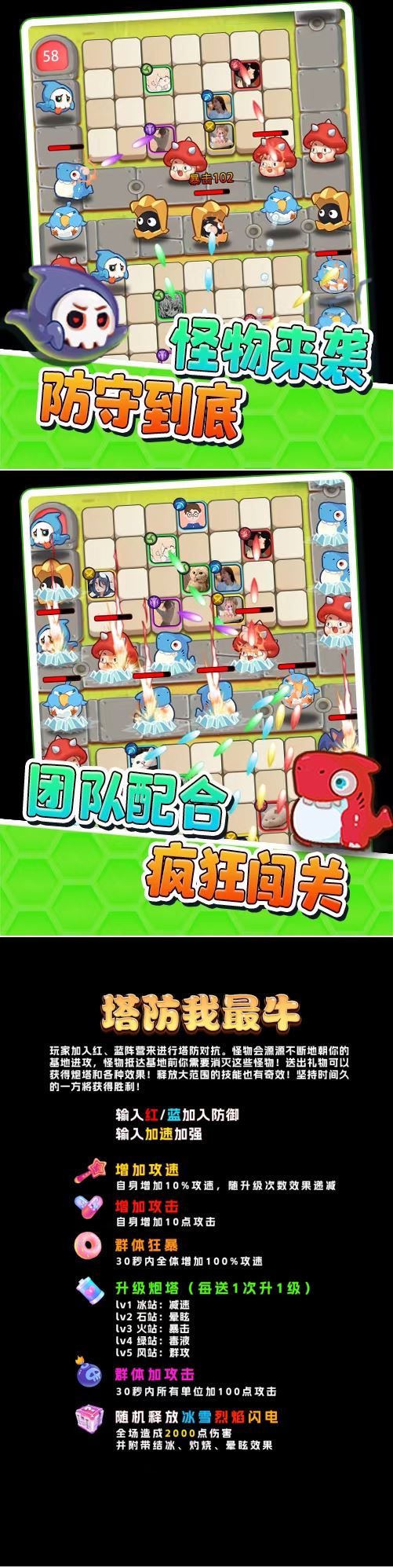 玩家加入红、蓝阵营来进行塔防对抗。怪物会源源不断地朝你的基地进攻,怪物抵达基地前你需要消灭这些怪物!送出礼物可以获得炮塔和各种效果!释放大范围的技能也有奇效!坚持时间久的一方将获得胜利!