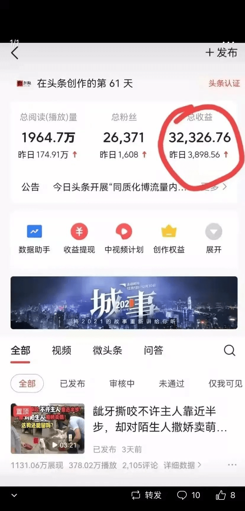 一平台的扶持,平台给予达人的流量扶持。二是3个平台同步,抖音,西瓜,今日头条,平台按照这几个播放量的总和来计算,懂行的人早已月入十万+。